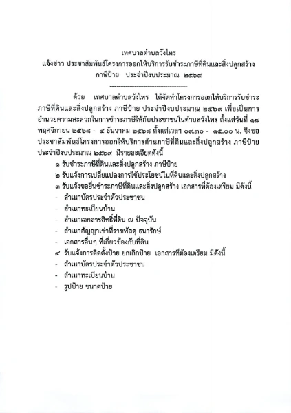 เทศบาลตำบลวังไทร ยังให้บริการรับชำระภาษีเคลื่อนที่ ภาษีที่ดินและสิ่งปลูกสร้าง, ภาษีป้าย ที่วัดวังไทร ถึงวันศุกร์ที่ 21 เวลา 09:30 - 15:00 น ขอเชิญชาวบ้านวังไทร บ้านป่าอ้อย และบ้านหนองไผ่พัฒนา มารับบริการได้ครับ สำหรับหมู่บ้านอื่นๆ ดูกำหนดการณ์ในคอมเม้นท์นะครับ